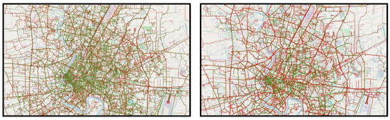 where, and are the average speed on the road network segment , and grid network , respectively at a time interval of , such that and are the sum of the speed of all the points with and as the total number of points belonging to its respective network. The use of two different average speeds was because not all road network segments had the probe GPS point associated with it at a given time interval. In such cases, the road network segment average speed could not be computed. Hence, grid network average speed was used instead for the given road network segment associated with it at the given time interval. In this regard, road network travel time was given by Equation (7).