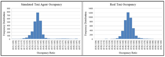 The occupancy ratio analysis showed for simulated taxi agent data occupancy was clustered around 37–41%, whereas for the real taxi data, occupancy ratio was clustered around 48–52%. Though simulated taxi data showed slight underestimation regarding occupancy ratio; the overall distribution was kept similar to the real taxi data.