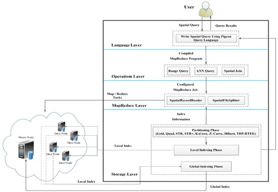 A SpatialHadoop cluster has one master node that divides a map-reduce job into smaller tasks, distributed to and executed by slave nodes. As shown in Figure 1, users access SpatialHadoop through The Pigeon Language in the Language layer to process their datasets. The Pigeon is an SQL-like language that supports the Open Geospatial Consortium (OGC) standard that was developed to simplify spatial data processing [37].