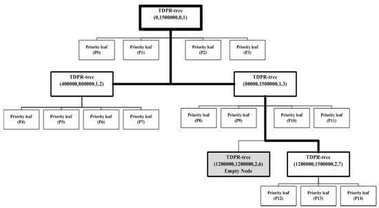 As an example, assuming that a file has 1.5 M records and B—the maximum capacity of the partition—is equal to 100,000 records, the desired number of partitions should be 15 partitions. Figure 2 shows the structure of the traditional PR-Tree of the file using Algorithm 1. It generates 12 partitions with a full capacity (100,000 records) and 16 partitions with 18,750 records each. Therefore, the traditional PR-Tree divides the input file into 28 partitions. Figure 3 shows the structure of the 2DPR-Tree for the same file. It generates 15 partitions at full capacity, achieving 100% space utilization and satisfying the desired number of partitions .