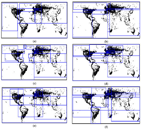 The Cities dataset indexed with different SpatialHadoop indexing techniques: (a) Cities indexed with the 2DPR-Tree; (b) Cities indexed with the KD-Tree; (c) Cities indexed with the Quadtree; (d) Cities indexed with the Hilbert-Curve; (e) Cities indexed with the Z-Curve; (f) Cities indexed with the STR and STR+.