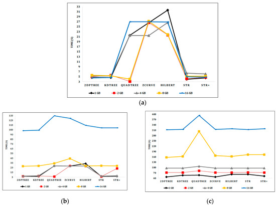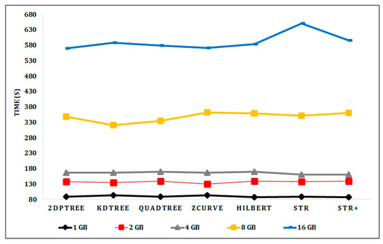 In order to show the effect of changing the size of the query window area on the performance of different partitioning techniques, a range query with a query window area equal to the input dataset area was performed. That query returned all objects in the input dataset and requires the indexing and partitioning technique to access all dataset partitions to obtain the query answer. By comparing results from Figure 7b,c, we find that answering a range query with a query window area equal to the whole input dataset area takes only three times the length of time that it takes to answer a range query with a query window area equal to 1% of the input dataset area. Therefore, the query window area does not have a significant effect on the performance of the range query with different indexing and partitioning techniques. The size of the input dataset, the number of partitions that are generated by the partitioning techniques, and the number of partitions that need to be accessed to get the result have the largest effect on the performance of the range query with different partitioning techniques. As shown in Figure 7b,c, the Quadtree method that divides the 8 GB and 16 GB input datasets into 256 partitions takes much more time to answer the query than the other techniques that divide the 8 GB and 16 GB input datasets into 77,154 partitions.