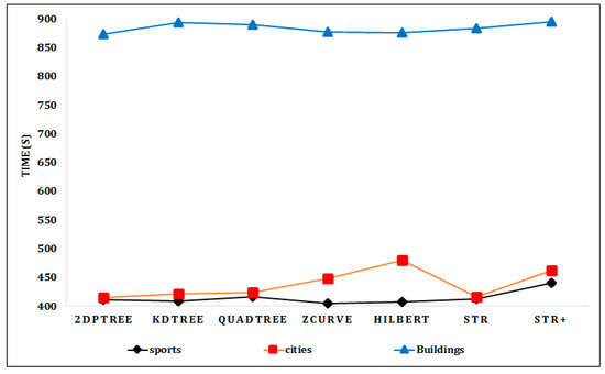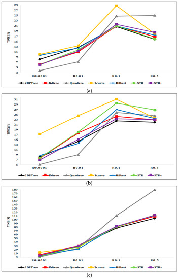 Figure 8a,b shows the range query processing performance on the Sports and Cities datasets with different query window areas. Quadtree has the best time performance for the range queries with small query window areas equal to 0.01% and 1% of the input dataset area. However, for the range queries with larger query window areas equal to 10% and 50% of the input dataset area, the Quadtree performance rapidly decreased. This is because when the query window area is increased, the number of partitions that is required to be processed to answer the range query is increased, especially for the Quadtree as it partitions the input datasets into a greater number of partitions than the other techniques. On the other hand, the 2DPR-Tree has the best time performance for the range query with query window areas equal to 10% and 50% of the input dataset area, as the 2DPR-Tree divides the input dataset into the desired number of partitions and the spatial proximity of the input shapes is always well preserved. The results shown in Figure 8c confirm our earlier claims as the 2DPR-Tree and the KD-Tree answer the range query with a query window area equal to 50% of the Buildings dataset area in 111 and 120 s, respectively, and Quadtree takes approximately twice the time to answer the same query.