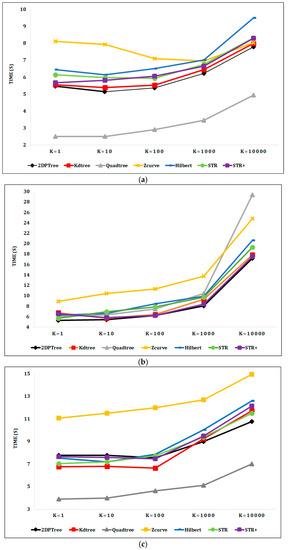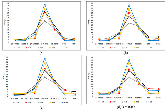 For the kNN query, query locations are arbitrarily chosen from points sampled from the input dataset. Figure 9a–d shows the kNN query performance over the indexed synthetic datasets as the input file size is increased from 1 to 16 GB and k varied from 1–1000. In the uniformly distributed synthetic data, all algorithms have roughly the same performance with different k values. The 2DPR-Tree and KD-Tree techniques, respectively, have the best query execution time for the synthetic datasets.