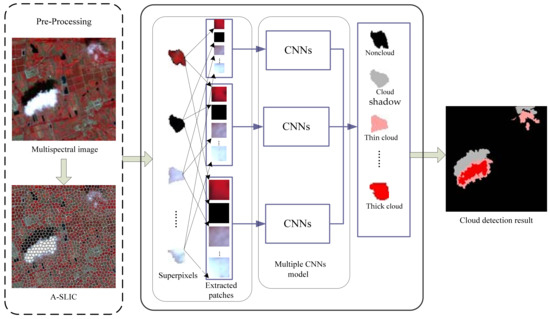 Proposed cloud detection framework. A-SLIC: adaptive simple linear iterative clustering; MCNNs: multiple convolutional neural networks.