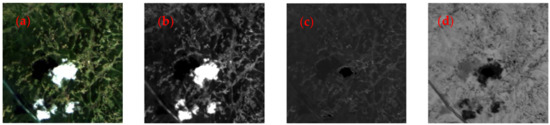 Figure 2 shows an example of the HSI color space. Figure 2a is an original RGB color image. Figure 2b–d shows an intensity component image, hue component image, and saturation component image, respectively. It can be seen that the cloud region is prominent in and components. So, and components are used in our proposed SLIC method.