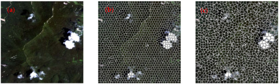 For cloud detection in high-resolution remote sensing images, many cloud detection methods are based on the pixel level [18], and a few cloud detection methods are based on the superpixel level [19]. In this study, the MCNNs model is adopted to extract multiscale features from high-resolution satellite imagery. Therefore, if pixels have been used as the basic unit of cloud detection, then the efficiency of the cloud detection method is very low. The term superpixel refers to the adjacent image blocks with similar color and brightness characteristics [20,21]. It groups the pixels based on the similarities of features and obtains the redundant information of the image, which greatly reduces the complexity of subsequent image processing tasks.