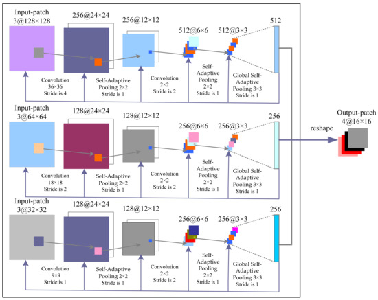 Figure 7 shows the proposed CNN architecture. In this study, we designed a multiple CNN model, which use three different-sized patches (128 × 128, 64 × 64, and 32 × 32) as the input data to extract features from remote sensing imagery. The output is a 1024-dimensional vector, which is reshaped into four 16 × 16 channels (thin cloud, thick cloud, cloud shadow, and background).