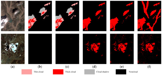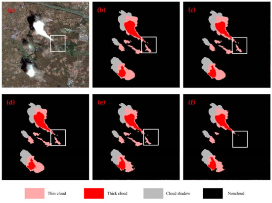 Multilevel cloud detection results using different CNN architectures: (a) original image; (b) ground-truth image; (c–f) our proposed approach, SAP + MCNNs, MP + MCNNs, and AP + MCNNs, respectively.