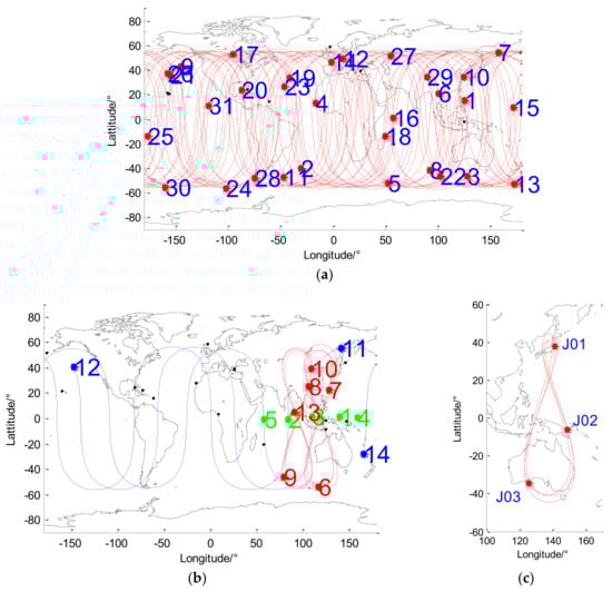 Ground tracks of Global Positioning System (GPS) satellites, Beidou Satellite Navigation System (BDS) satellites, and quasi-zenith satellites (QZS) on 1 March 2018 ((a) GPS; (b) BDS; and (c) QZSS.