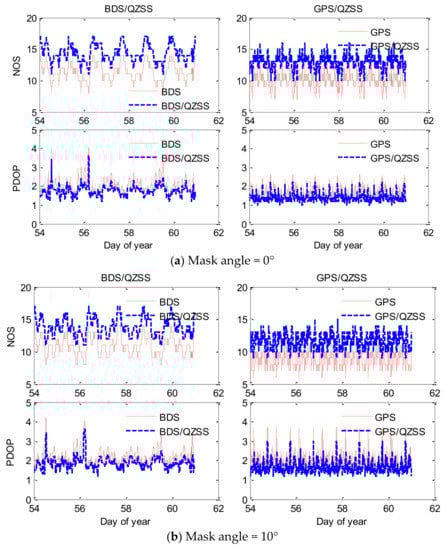 Average number of satellites (NOS)/minimum number and PDOP of different systems with different mask angles for the HKLT station from DOY 54 to 61.