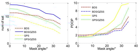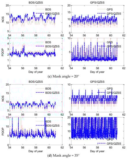 Availability mainly describes the number of visible satellites above the mask angles and is the most basic performance measure of a navigation system. The theoretical minimum number of satellites to achieve SFSE DD baseline resolution for a single system is 4 and for multisystem is n + 3, where n is the number of systems. PDOP is another indicator revealing the relative position quality of the constellation-user geometric structure. The more scattered the satellite distribution, the larger the geometric volume of the constellation and the higher the position precision []. To evaluate the availability and PDOP of the integrated GPS/QZSS and BDS/QZSS, the GPS, BDS, and QZSS data of a week was collected and calculated. The time interval ranges from 4 February to 2 March 2018, and the sampling frequency is 30 s. Figure 2 shows the number of visible satellites and the PDOP value under the BDS, GPS, BDS/QZSS, and GPS/QZSS cases with mask angles of 0°, 10°, 20°, and 35° at the HKLT station in Hong Kong, from day of year (DOY) 54 to 60. Table 2 gives the average number of visible satellites (minimum value) and the mean PDOP displayed in Figure 2. Figure 3 presents availability and PDOP trends with the increasing mask angle from 0° to 35°.
