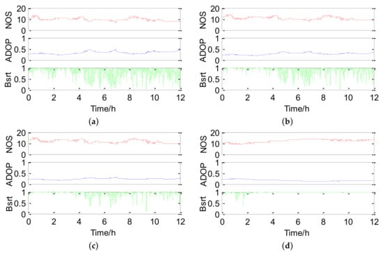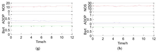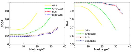 where, is the conditional standard deviations of the estimated ambiguities. We simulated the ADOP and Bsrt of a 10 km baseline at HKLT station in Hong Kong as the base station for a week. Figure 4 shows the mean ADOP and Bsrt of different systems with different mask angles which are counted in Table 3. The single GPS ADOP cannot be computed above a 20° mask angle, and GPS/QZSS ADOP cannot be computed above a 30° mask angle because the number of visible satellites is not sufficient. We can clearly draw the following conclusions: (1) The single GPS baseline resolution is limited by the number of satellites, especially when the mask angle is above 20°, and the combination of GPS/QZSS will improve the limitation; (2) GPS/QZSS achieves a great decrease in ADOP and a great increase in Bsrt compared to the single GPS; (3) The ADOP and Bsrt of BDS/QZSS are both better than that of GPS and GPS/QZSS; however, compared with the single BDS, the improvement of BDS/QZSS is relatively slight. In addition, it can be easily found that the Bsrt of a 0° mask angle is slightly lower than that of 5°. The signal from a low-elevation satellite is easily affected by shelter, such as buildings, surface fog, and haze. The noise error of the satellite signal at 0° is relatively larger than that at 5°, which will mitigate the corresponding bootstrapped success rate.