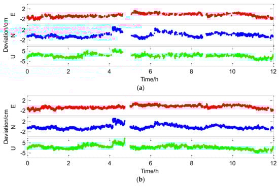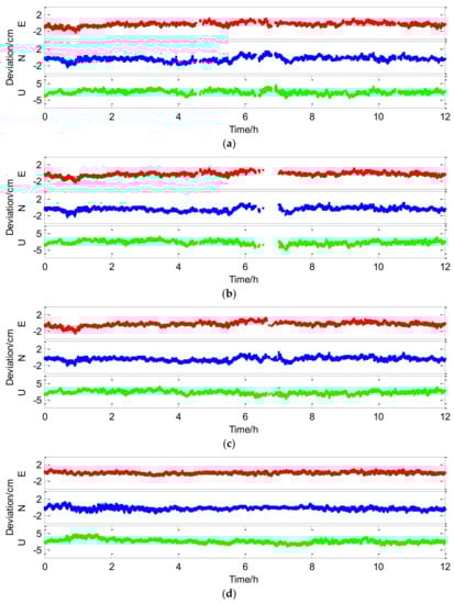 where denotes the E/N/U sequences of the baseline resolution and donates the reference value; represents the RMS errors of the E/N/U component and n is the length of the sequence. Then the precision of the baseline can be computed by