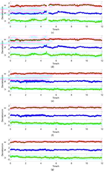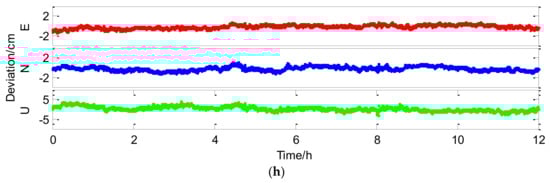 Position errors of different strategies: (a) GPS; (b) GPS + 1QZS; (c) GPS + 2QZS; (d) GPS + 3QZS; (e) BDS; (f) BDS + 2QZS; (g) BDS + 3QZS and (h) BDS + GPS + 3QZS for the 12.5 km baseline.