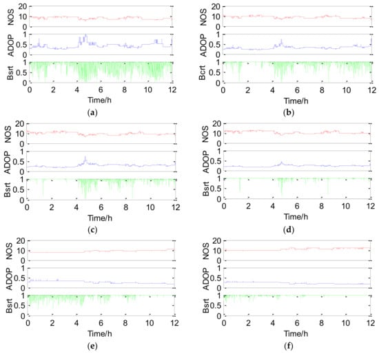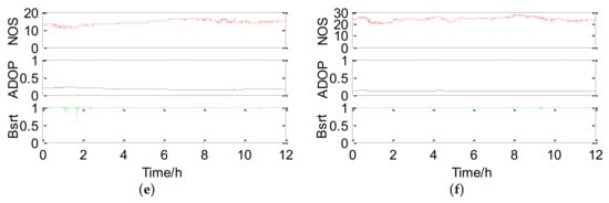 Mean NOS, ADOP and Bsrt of different strategies: (a) GPS; (b) GPS + 1QZS; (c) GPS + 2QZS; (d) BDS; (e) BDS + 2QZS; (f) BDS + GPS + 2QZS for 4.8 km baseline.