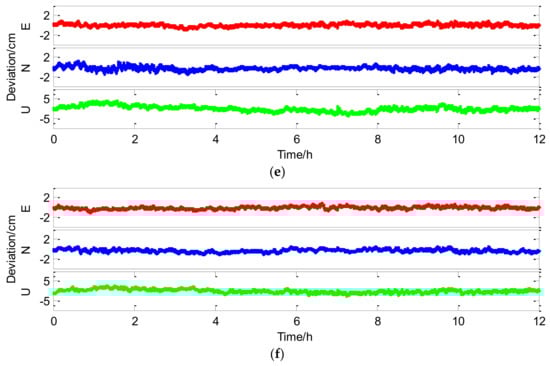 Position errors of different strategies: (a) GPS; (b) GPS + 1QZS; (c) GPS + 2QZS; (d) BDS; (e) BDS + 2QZS; (f) BDS + GPS + 2QZS for 4.8 km baseline.