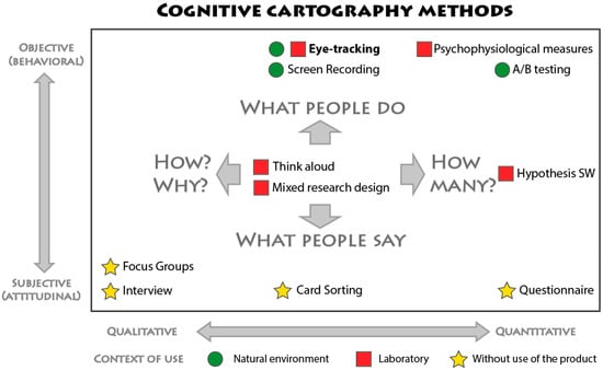 Various methods can be used to analyze maps and cartographic visualization in spatial planning. Rohrer [26] presented “A Landscape of User Research Methods”, in which various user-experience research methods are shown on a three-dimensional framework with the following axes: