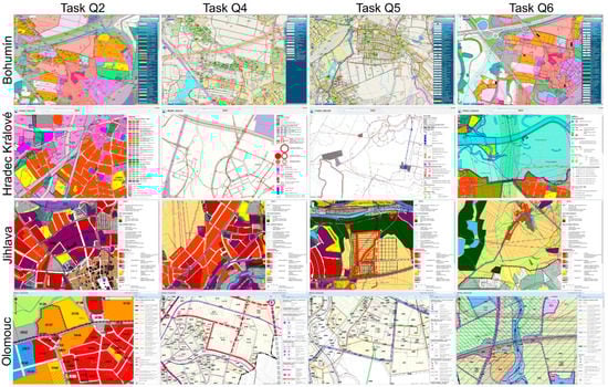 To cover the most typical tasks during standard work with an urban plan (i.e., finding a new place for housing or identifying areas with proposed public services), analysis of the urban plans was based on six tasks. There are many different taxonomies of tasks (see [58] for a detailed description). According to the commonly used Wehrend and Lewis [59] objective-based taxonomy, we used the simplest task category (Identify). To prevent any misunderstandings, the tasks were created to be as simple as possible. The tasks focused on the point, line and polygon map features to cover as many cartographical symbols as possible. One task (Q3) involved proposals, not real conditions. The following questions were asked: