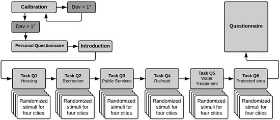 Finally, six standalone webpages were obtained for each city. Eye-tracker SMI RED 250 (developed by SensoMotoric Instruments, Berlin, Germany) with a sampling frequency of 250 Hz was used in the study, and the experiment was created at the SMI Experiment Center. Stimuli were presented on a monitor with a resolution of 1920 × 1200 px. At the beginning of the experiment, the respondents completed a short questionnaire about their age and experience, and then calibration was performed. We set a calibration threshold of 1° of the visual angle. Respondents with a higher deviation were excluded from the results, along with those whose Tracking Ratio (the proportion of time that the eye tracker recorded point of gaze coordinates over the entire experiment) was higher than 90%. After calibration, respondents were informed about the purpose of the experiment and provided with some basic information about urban planning. The tasks were then presented. No time limits were set for respondents to read and remember the task. After pressing the F2 key, an Internet browser would open, displaying a webpage with one of the stimuli automatically. The tasks were presented sequentially from Q1 to Q6. The city plans were randomized for each task. At the end of the experiment, a short questionnaire about the respondents’ subjective opinions on the presented plans was displayed. This questionnaire was created in Google Forms and contained an image of the representative plan for each city (to remind the respondent how it looked) and a scale from 1 (best) to 5 (worse). The experiment was ten to fifteen minutes long. A diagram showing the experiment’s design is in Figure 3.