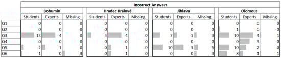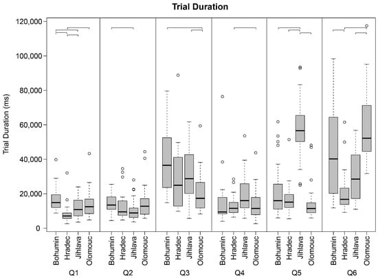 For the first task, statistically significant differences were found between the four pairs of cities. The most efficient plan was the Hradec Králové plan. By contrast, the highest values of Trial Duration were observed for the Bohumín plan. In this case, the legend is not structured, and finding housing areas took a longer time. In Q2, the results were almost balanced. The best results were recorded for the Jihlava plan, the worst for the Bohumín plan. A statistically significant difference was observed between these two plans. In Q3, Trial Duration for the Bohumín plan was again the highest. The best results were obtained for the Olomouc plan. Balanced results were obtained in Q4, where overall Trial Durations were relatively low. The worst results were obtained for the Jihlava plan, the best for Bohumín. Again, a statistically significant difference was observed between the Trial Duration values of these plans. The highest value of Trial Duration from the whole experiment was recorded for the Jihlava plan in Q5. Statistically significant differences were found between this plan and all others. The respondents had to find the wastewater treatment plant, which was not easy because of the use of incorrect map symbols (the symbol in the legend was not equivalent to the symbol on the map). Very different values of Trial Duration between certain plans were observed in Q6. This task focused on finding a protected area of water resources. The legend of the natural protection map was very complex in the Olomouc case. It contained more than 200 symbols and the description of each symbol was also relatively long. Thus, it took a long time for respondents to complete this task with the Olomouc plan.