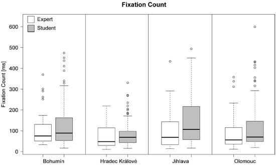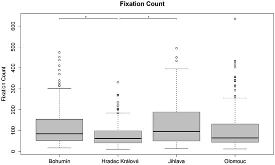 Boxplot of Fixation Count values. According to the results of the Kruskal–Wallis test, statistically significant differences were found between the plans of Hradec Králové and Bohumín and those of Hradec Králové and Jihlava.