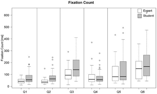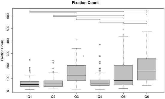 For the next analysis, Fixation Count was chosen. A higher number of fixations indicates either a low level of efficiency during a search or an inconvenient user interface [34]. We presumed that respondents would perform fewer fixations on urban plans with structured legends and better legibility. However, the values of Trial Duration and Fixation Count are highly correlated, and the boxplot displayed in Figure 4 looks very similar to the Fixation Count.