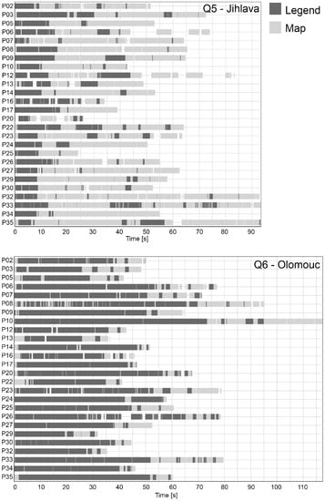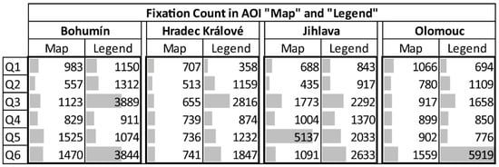 Areas of Interest (AOIs) were marked around the map and legend of each stimulus. Areas of Interest are regions in the stimulus in which the researcher is interested [60]. The number of fixations in each AOI were calculated and are shown in Figure 7. It was difficult to locate the correct symbol in the legend for Tasks Q3 and Q6. In Q3, the map symbol for proposed public services was in the legend in the second column, which influenced a high number of fixations in identifying the correct symbol. The most fixations in the legend were observed in Q6 (Olomouc). This result was due to the position of the correct symbol in the legend (in the lower part).