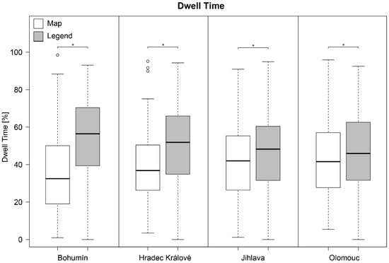 The most important metric for describing user interactions with AOIs is Dwell Time. Dwell Time is calculated as a sum of all of the fixation durations within a prescribed area, in this case, the map and the legend [69]. Figure 8 shows the relative values of Dwell Time for each city. For each city, respondents spent statistically significantly more time in the legend than on the map. The biggest difference was observed for Bohumín, where the legend was not structured at all. This can be interpreted also as the result of low map legibility due to the low level of associativity of the map symbols. In the next part, a detailed analysis of Dwell Times according to the tasks was performed.