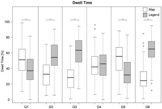 Boxplot of Dwell Time values for AOI around the Map and Legend. Statistically significant differences between the maps and legends were found for all tasks except Q4.