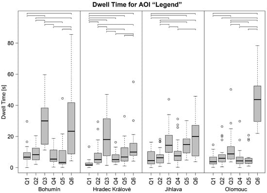 In Figure 9, the ratio between time spent on the map and the legend is presented. Figure 10 displays the values of Dwell Time for the AOI “Legend” only. The results show that the most problematic search in the legend was in Tasks Q3 and Q6. High Dwell Time values for these tasks can be explained as the same as above—the proposal for Q3 and location of the symbol at the bottom of the legend for Task Q6.