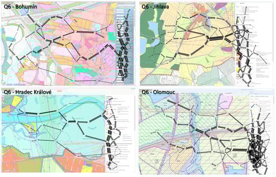 Figure 2 shows an overview of the stimuli used. Tasks Q1 and Q3, which were used in our analysis, were omitted from this overview because these tasks were given on the same plan as for Q2 (Zoning map). Plans in higher resolution can be accessed via www.eyetracking.upol.cz/urban, where all the stimuli used in the eye-tracking experiment are displayed. All the stimuli were prepared to a resolution of 1920 × 1200 px.