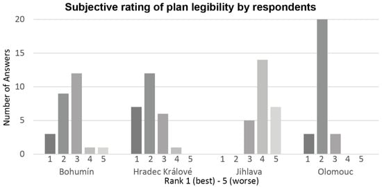 A similar conclusion follows from the respondents’ average ranking of plans (Olomouc, 2; Hradec Králové, 2.04; Bohumín, 2.54; and Jihlava, 4.07). Plans that used correct, clear and structured legends with a small number of map symbols and colors were ranked much higher.