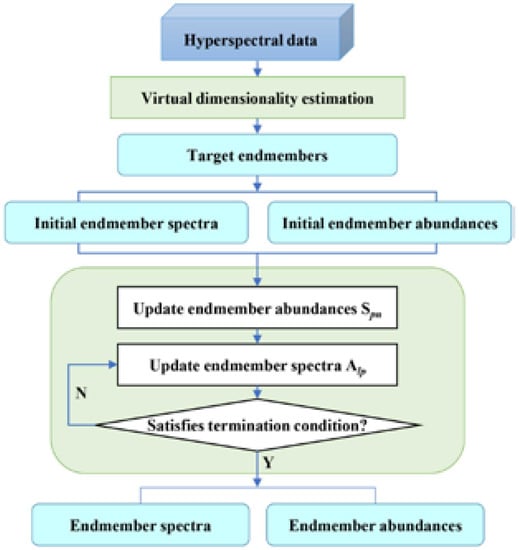 - Final endmember matrix and endmember abundance matrix : matrices and are repeatedly updated until the maximum number of iterations is reached or until the stopping condition is satisfied, i.e., the value of the objective function is equal to zero or the prescribed error threshold .where is the reconstruction of after the iteration.