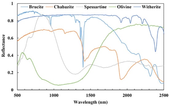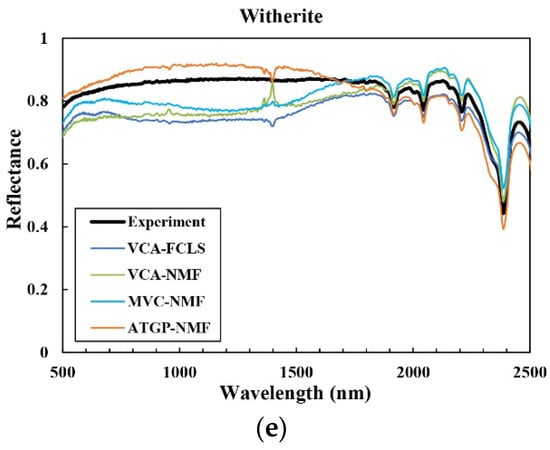 The hyperspectral synthetic data were generated using five spectral signatures randomly selected from the United States Geological Survey (USGS) digital spectral library [], i.e., those for brucite, chabazite, olivine, spessartine and witherite (Figure 2). These spectral signatures are linearly independent and can be regarded as endmembers []. All signatures are available online (http://speclab.cr.usgs.gov/spectral-lib.html). The spectral data contain 420 bands covering wavelengths from 395.1–2560 nm. To create the linear mixtures, the abundance of each endmember was randomly determined using the Dirichlet distribution under the ANC and ASC. Moreover, to simulate possible errors and sensor noise, zero mean white Gaussian noise with a 30-dB signal-to-noise ratio (SNR), as defined in [], was added to the mixture dataset.