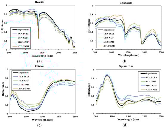 Comparison of the extracted endmember signatures using vertex component analysis (VCA)-fully-constrained least squares (FCLS), VCA-NMF, minimum volume constrained (MVC)-NMF and ATGP-NMF with the experiment data, spectral signals from the USGS digital spectral library for (a) brucite; (b) chabazite; (c) olivine; (d) spessartine; (e) witherite.