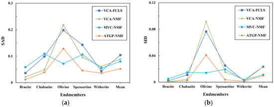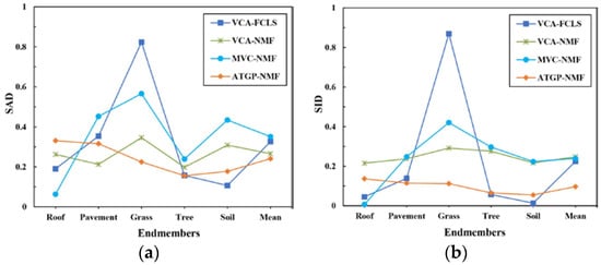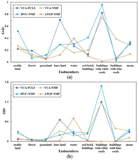 (a) Spectral angle distance (SAD) and (b) spectral information divergence (SID) of different endmembers with the synthetic data determined using VCA-FCLS, VCA-NMF, MVC-NMF, and ATGP-NMF.