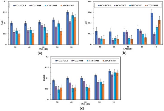 (1) Robustness to noise interference: In this experiment, tests of the algorithms’ sensitivities to noise were carried out by changing the SNR level from 50 to 10 dB. The synthetic data consist of five endmembers, i.e., the spectral signatures selected from the USGS spectral library, at the purity level of 0.8, which means pure pixels do not exist. The SAD, SID and RMSE values of the four algorithms are shown in Figure 5a–c, respectively. The ATGP-NMF algorithm performed well, yielding lower SAD and SID values than the other algorithms at different SNR levels. With the decrease in SNR, the RMSE values of ATGP-NMF decreased and stabilized; for MVC-NMF, the RMSE values kept increasing.