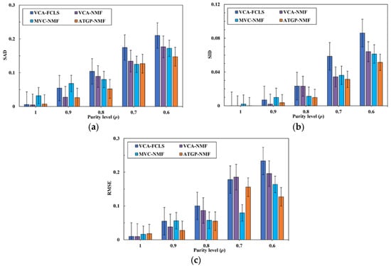 Results of the algorithms with different purity levels (SNR = 30 dB, p = 5). (a) SAD; (b) SID; and (c) RMSE.