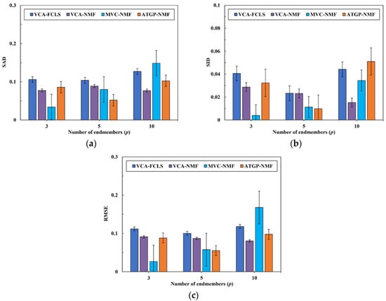 Performance comparison at different numbers of endmembers (SNR = 30 dB, ρ = 0.8). (a) SAD; (b) SID; and (c) RMSE.