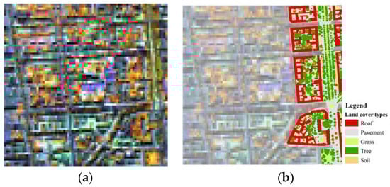 (a) A subset of the Berlin HyMap image (R = 833 nm, G = 1652 nm, B = 632 nm); (b) the reference land cover map of the study area.