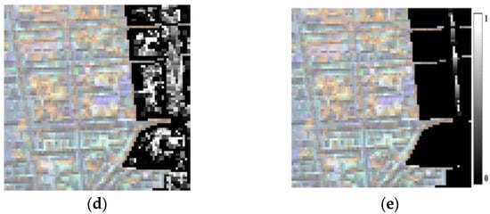 Abundance maps provided by ATGP-NMF with the Berlin HyMap image: (a) roof; (b) pavement; (c) grass; (d) tree; (e) soil.