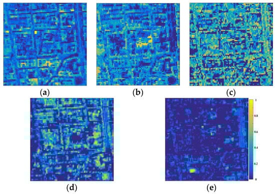 Reference abundance maps of five land cover types: (a) roof; (b) pavement; (c) grass; (d) tree; (e) soil.