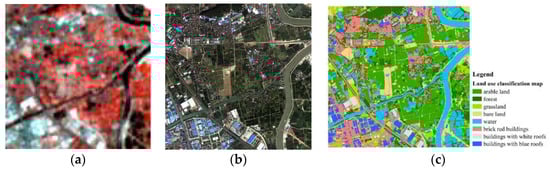 (a) Hyperion image of the study area (R = 936 nm, G = 2143 nm, B = 2345 nm); (b) the high-resolution remote sensing image covering the study area; (c) the land use classification map of the study area.