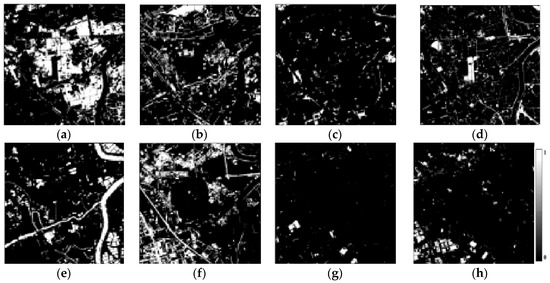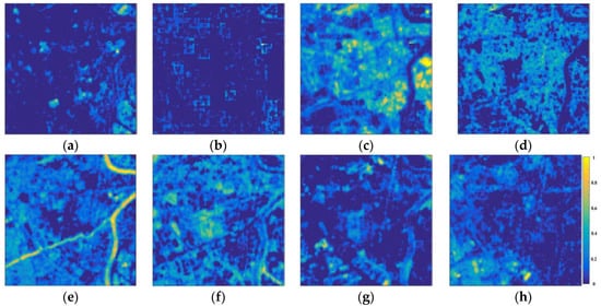 Abundance maps provided by ATGP-NMF with the Hyperion image: (a) arable land; (b) forest; (c) grassland; (d) bare land; (e) water; (f) red brick buildings; (g) buildings with white roofs; (h) buildings with blue roofs.