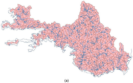 Basin boundaries are obtained based on drainage networks that are derived from digital elevation models (DEMs) in geographical information systems (GIS). Drainage networks are derived from DEMs through the following main process steps: (1) filling the depressions, (2) determining the flow directions, (3) calculating the flow accumulation values, and (4) deriving the drainage networks according to the flow accumulation values [1,2].