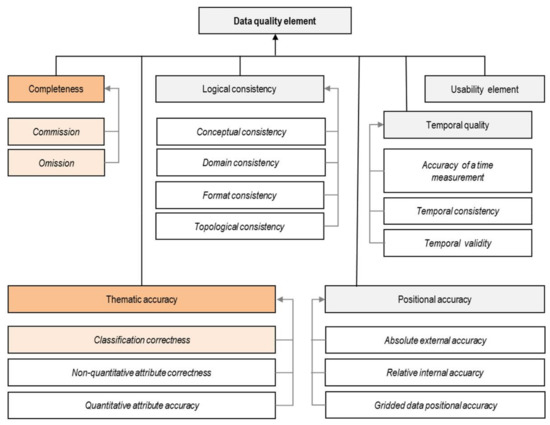 Overview of the ISO 19157:2013 data quality elements modified [14]. The focus of the present study is highlighted.