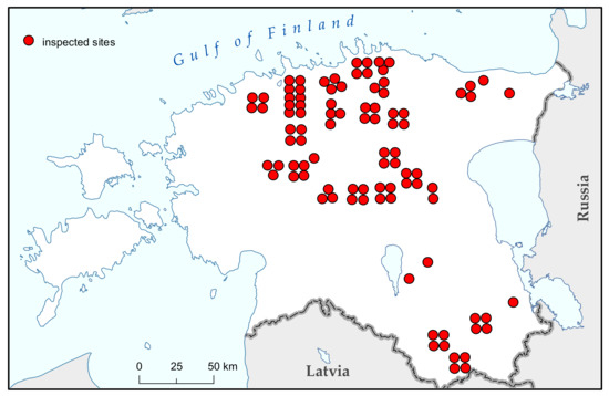 To define the size of the controlled area, which was used for spatial analysis and the calculation of quality measures, we generated buffers around the field inspection routes. We used buffer widths of 50 m on either side of the route if the surrounding landscape had a “closed” viewshed (e.g., was located in forests, shrubs, or built-up areas) and 100 m in landscapes with “open” viewsheds. The routes were 11 to 15 km long. The quality control results were obtained from 2003 to 2006, and were recorded in an error database that comprised 5100 records. In total, the work of 21 workers was inspected by 6 quality controllers at 93 sites (Figure 2), which covered all main landscape types in Estonia [44]. The field workers were trained in the field classification of a landscape and supported by a detailed mapping specification [45] that included detailed descriptions of each category. Moreover, in each spring before the mapping season, a joint two-day seminar for all workers and quality controllers was held in order to harmonise their feature classifications. At the time of the survey, workers had 2 to 11 years of fieldwork experience. For each field worker, we also obtained data about their gender and years of experience. Because no formal skill assessments were obtained for the field workers, we used their years of experience as a proxy for their skill level.