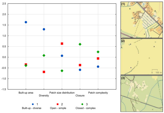 Plot of the mean factor values of landscape factors and built-up areas for the three landscape clusters (types) and examples of maps for those landscape clusters: (1) built-up-diverse landscape; (2) open–simple landscape; and (3) closed-complex landscape.