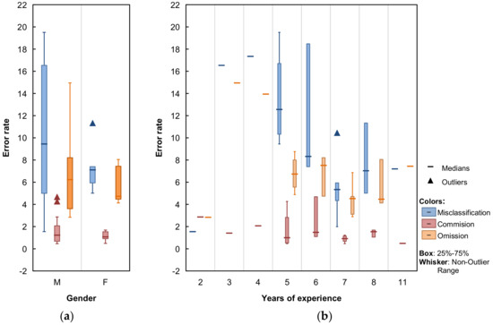 Several studies that investigated the differences in spatial ability and orientation between men and women found that men and women interpret space differently, and most of the studies suggested that men had better spatial orientation abilities [37,38,39]. Coluccia et al. [38] also pointed out that in their study of volunteer classifiers, men approached maps from a global perspective (the pattern of routes), whereas women focused on local features (landmarks). This might give women an advantage in mapping. Our results showed that women generally had lower error rates, although the difference from men was not statistically significant. This might be because all field workers in our study were trained before mapping and were professionals, whereas the participants in previous studies were mostly volunteers with no previous training or professional mapping experience. This demonstrates the importance of training, particularly if a worker’s classifications can be assessed quickly to detect errors so that they can be trained to avoid these errors.